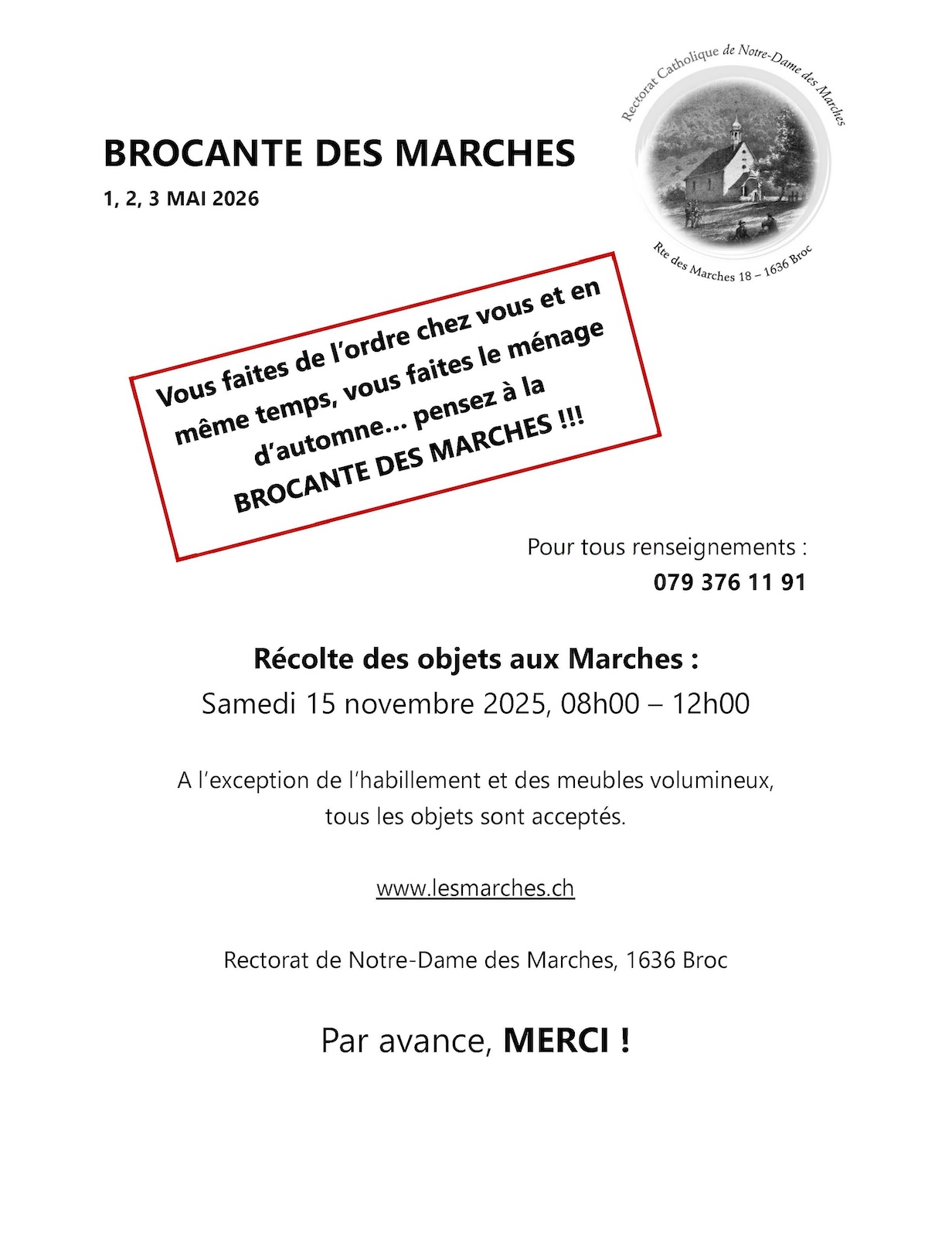 Suite au premier Pèlerinage des malades qui eut lieu en 1945 à la chapelle de Notre-Dame des Marches à Broc, il a été décidé de fonder « L’ Œuvre des Malades ». Son comité est à l’heure actuelle toujours chargé d’organiser les deux pèlerinages qui ont lieu chaque année au printemps et en automne. Il peut compter sur le dévouement de nombreux bénévoles qui généreusement mettent leur temps et leur savoir-faire à disposition… en savoir plus